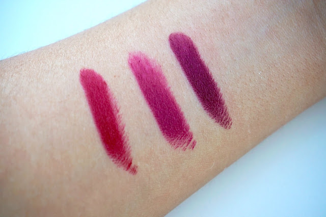 All the colors are matte finish, which I love, and they are incredibly pigmented. Siren is a "matte Bing cherry," Beau a "matte raspberry," and Heartbreaker a "matte Syrah." I didn't know what Syrah was until I Googled it and it's wine, which is a very accurate description for that color.